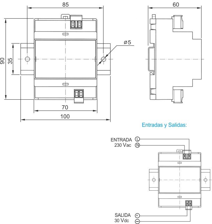 Tensión de entrada 230 Vac Tensión de salida 30 Vdc CARACTERÍSTICAS MECÁNICAS :